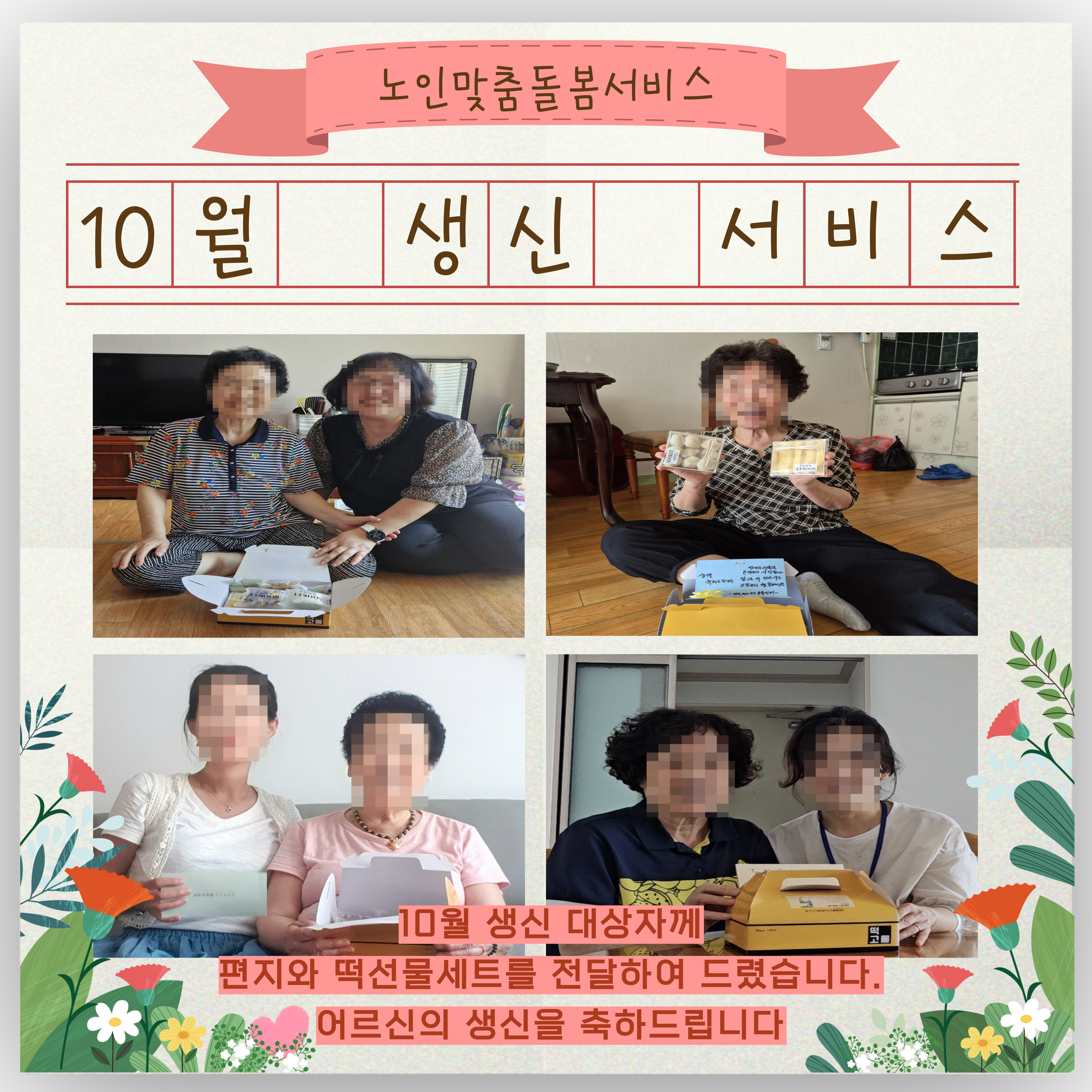 4. 내 용 : 외로움과 고독감으로 정서적 문제를 겪고 있는 노인맞춤돌봄서비스 대상자에게 개인별 맞춤형 생신잔치를 제공(생신떡 선물세트, 축하편지 전달 및 말벗상담)
